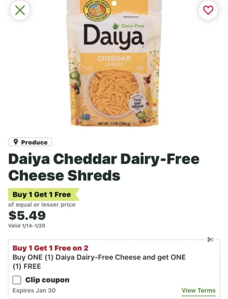 2 Free Daiya Cheese Packs at Publix with Publix App Leave a Comment / Free Food / By Awesome Freebies How To Redeem Check your Publix App or click the link below. Clip the BOGO coupon. They are also on sale as a BOGO making it 2 free. Expires 1/20/2026 Click for offer