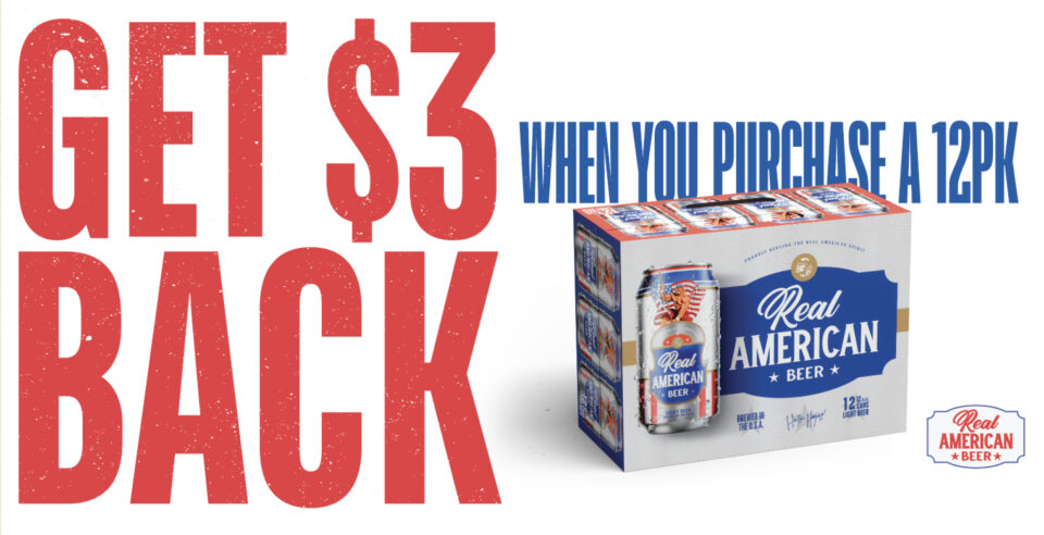Offer valid only on purchases made from 2/1/25 through 5/31/25. Get $3.00* back via rebate on your purchase of one (1) 12-pack of Real American Beer. Must purchase Real American Beer products to qualify for the rebate. Requests must be received by 6/2/25. Limit one (1) rebate per person per week.