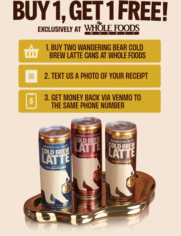 BOGO Wandering Bear Cold Brew Coffee Lattes at Whole Foods Leave a Comment / Other Food Deals, Other Rebate Company / By Awesome Freebies How To Redeem Buy One Get One Free! Through Brij Rebates. Submit a picture of your receipt through the link below and get your money reimbursed through Venmo. Click for offer