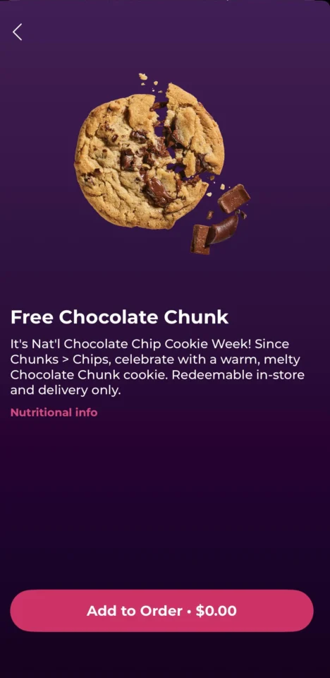 Free Chocolate Chunk Cookie at Insomnia Cookies Leave a Comment / Free Food / By Awesome Freebies How To Redeem Expires March 9th 2026 Check your app for the offer. If you have issues placing the order online, walk into the store and entered your phone number and ask the clerk to add the reward in-store