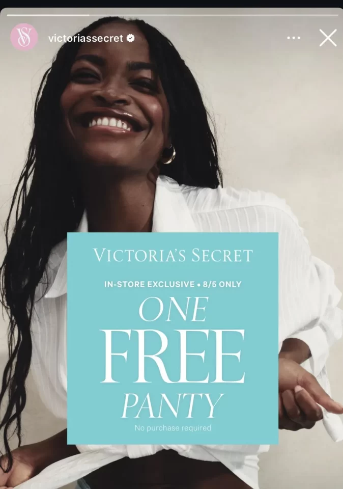 Free Pair of Victoria’s Secret Panties for National Underwear Day (8/5) Leave a Comment / Free Stuff / By Awesome Freebies How To Redeem Just go up to the register to check out and show them the screenshot. Up to $14.95. No purchase required. Find your closest store here