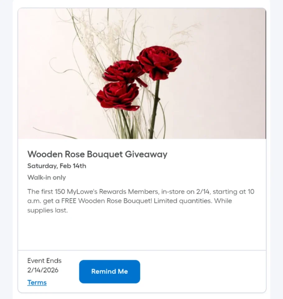 Free Wooden Rose at Lowe’s for Valentine’s Day 2/14 for Rewards Members Leave a Comment / Free Stuff / By Awesome Freebies How To Redeem First 150 members in each store starting at 10AM